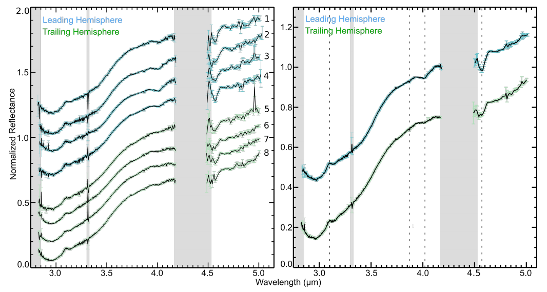 Tutti gli otto spettri che abbiamo raccolto mostrano la banda di 4 micron. I quattro spettri raccolti sull'emisfero principale di Callisto mostrano bande di 4 micron significativamente più forti rispetto ai quattro spettri dell'emisfero finale (differenza> 3 sigma).
