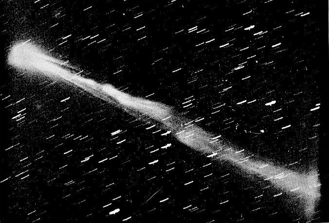 9. Le comete splendono in parte per luce riflessa imprestata dal Sole, in parte per luce propria, che ha i caratteri della luce emessa dai gas o vapori incandescenti. La luce delle loro chiome, esaminata allo spettroscopio, si risolve infatti in un debole spettro continuo difficilissimo a vedersi, associato ad uno spettro marcato, discontinuo, costituito da tre bande o striscie luminose, una gialla, l’altra verde, la terza azzurra, separate da larghi intervalli apparentemente oscuri, spettro quest’ultimo che è appunto proprio di masse gassose portate allo stato di incandescenza, o di luminosità propria. Per gran tempo tutte le comete osservate diedero lo stesso spettro, e, poichè questo spettro è identico a quello degli idrocarburi, se ne inferì che le comete tutte sono probabilmente formate dagli identici materiali, e che in esse poverissima è la varietà dei materiali stessi.